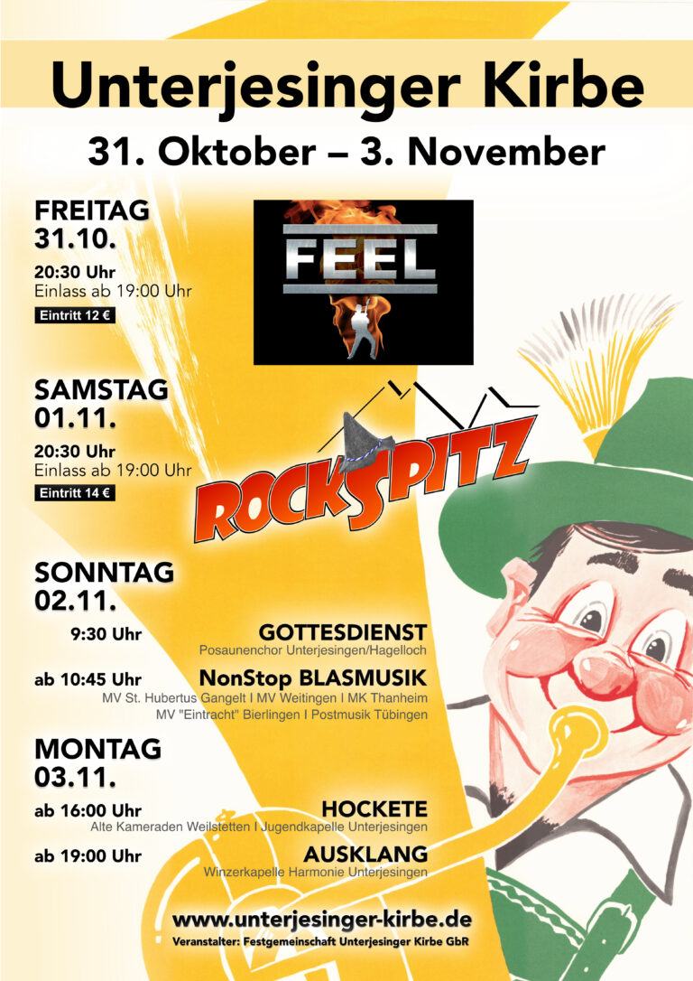 Wie in jedem Jahr hält die Unterjesinger Kirbe auch für das leibliche Wohl all das bereit, was das Herz begehrt: von der traditionellen Schlachtplatte bis hin zu den bekannten Festspezialitäten. Außerdem bieten sich vor dem Festzelt einige Attraktionen für die jüngeren Besucher, damit auch für die Jüngsten der Besuch der Kirbe zum Erlebnis wird.